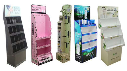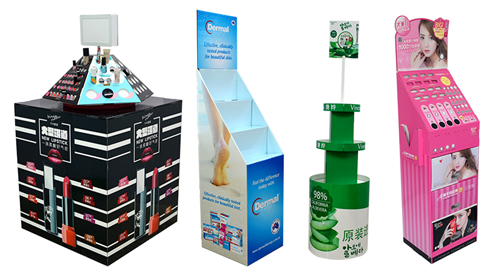化妝品紙板堆頭類:有面膜、彩妝、護膚品等。體積大但容納性強,易組裝打包方式便捷,能快速鋪貨,節(jié)省人工運輸成本,畫面豐富多彩,讓人眼前一亮。